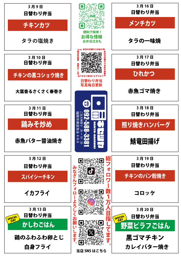 オフィス向け日替わり弁当3/9~3/20分更新いたしました。